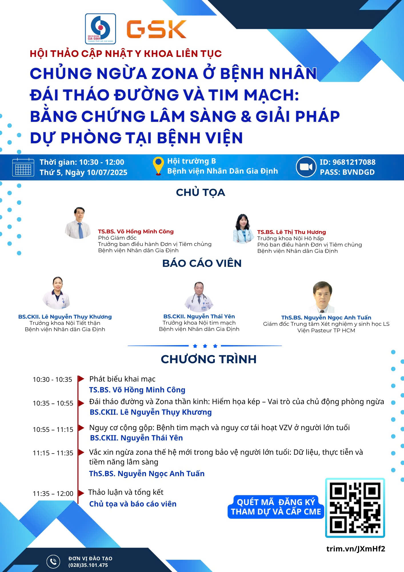 Bệnh viện Nhân dân Gia Định tổ chức chương trình cập nhật y khoa liên tục chủ đề: “Chủng ngừa Zona ở bệnh nhân đái tháo đường và tim mạch: Bằng chứng lâm sàng & giải pháp dự phòng tại bệnh viện” với những nội dung sau: