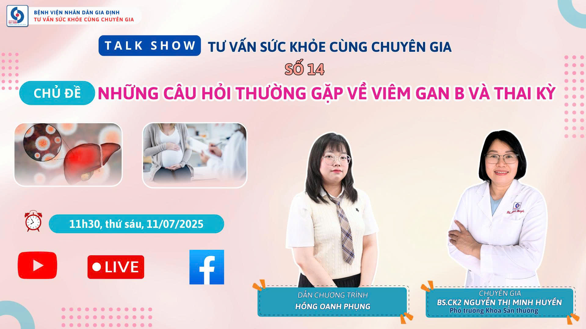 ✨ Hiểu được mối quan tâm này, Bệnh viện Nhân dân Gia Định thực hiện chương trình “Tư vấn sức khỏe cùng chuyên gia” số 14 với chủ đề: “Những câu hỏi thường gặp về viêm gan B và thai kỳ”. Đồng hành trong chương trình là BS.CKII Nguyễn Thị Minh Huyền – Phó Trưởng khoa Sản thường sẽ trực tiếp giải đáp các thắc mắc của khán giả liên quan đến căn bệnh này trong suốt thai kỳ.