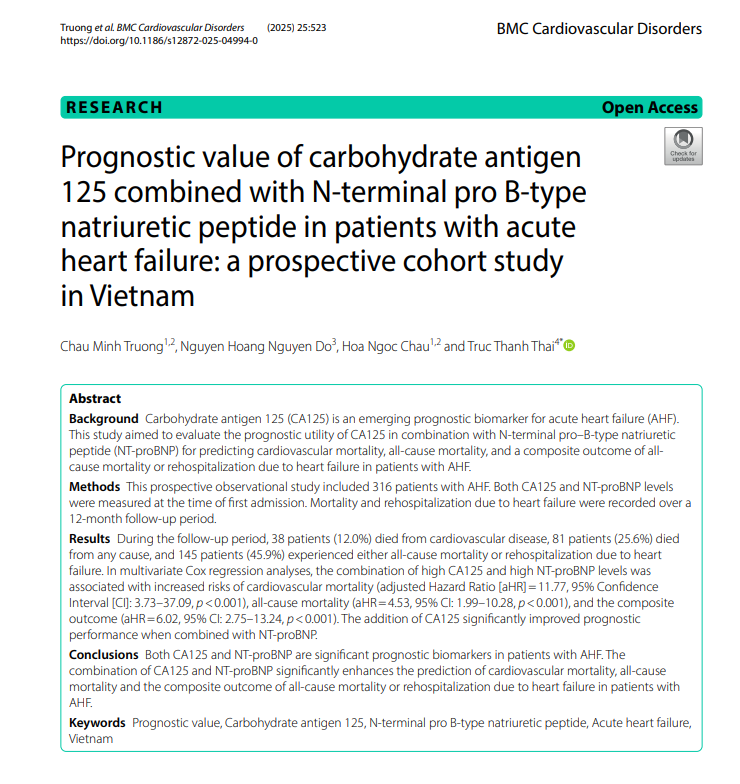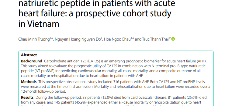 Bài báo thứ hai là “Kết hợp CA125 và NT-proBNP trong tiên lượng bệnh nhân suy tim cấp: nghiên cứu đoàn hệ tiến cứu tại Việt Nam” (Prognostic value of carbohydrate antigen 125 combined with N-terminal pro B-type natriuretic peptide in patients with acute heart failure: a prospective cohort study in Vietnam)