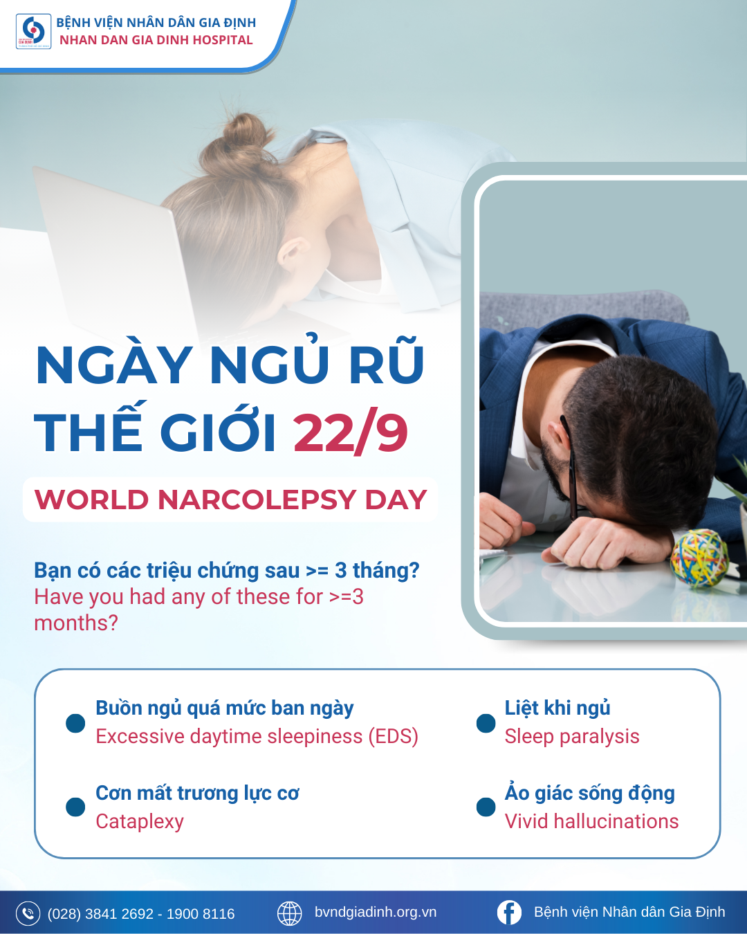 👉 Nếu quý vị hoặc người thân có triệu chứng buồn ngủ ban ngày quá mức, ngủ gục bất thường hoặc nghi ngờ chứng ngủ rũ, hãy đến khám tại Phòng khám và Thăm dò Giấc ngủ – Khoa Hô hấp, Bệnh viện Nhân Dân Gia Định để được chẩn đoán và tư vấn điều trị.