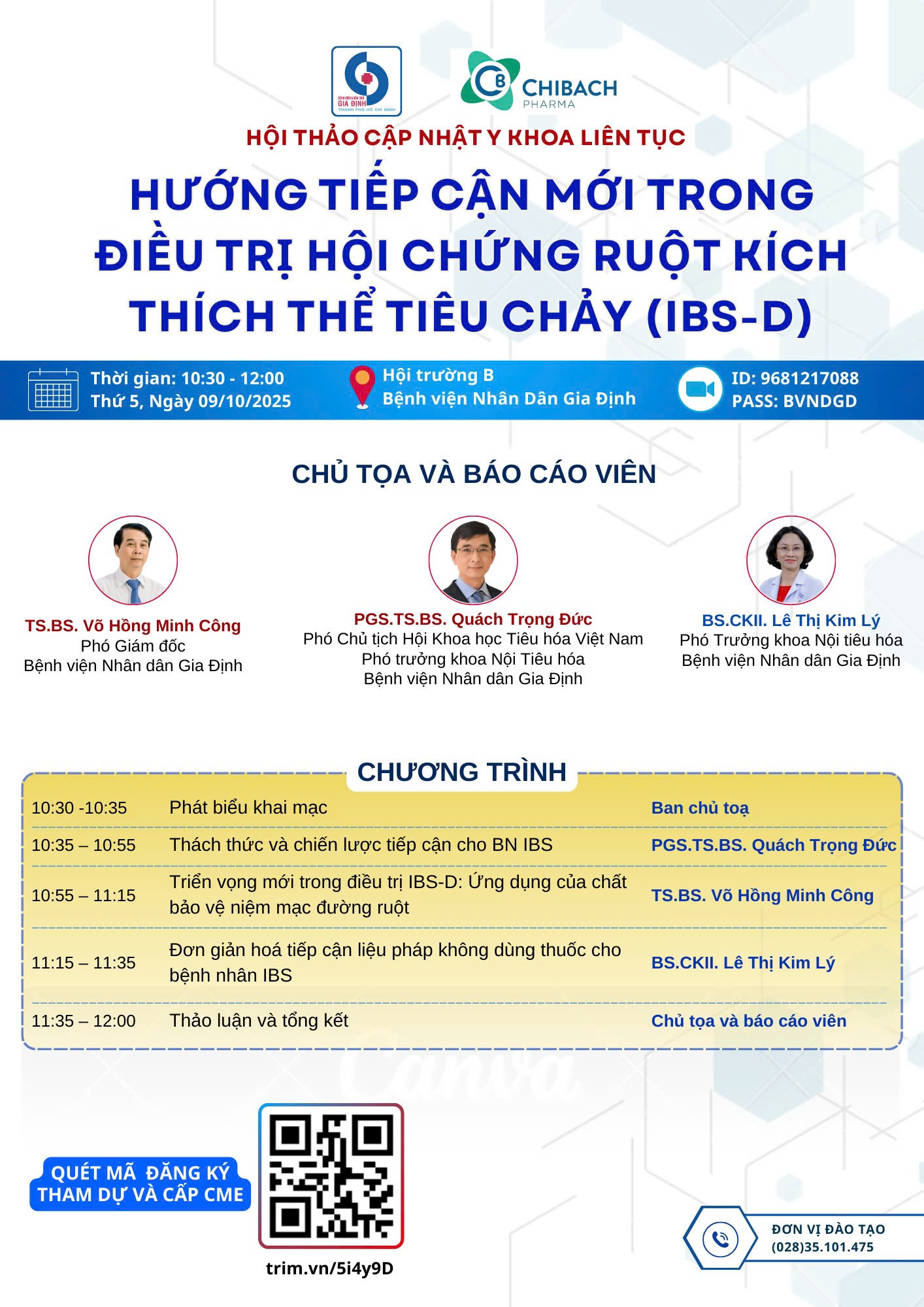 Bệnh viện Nhân dân Gia Định tổ chức chương trình cập nhật y khoa liên tục chủ đề “Hướng tiếp cận mới trong điều trị Hội chứng ruột kích thích thể tiêu chảy (IBS-D)” với những nội dung sau: