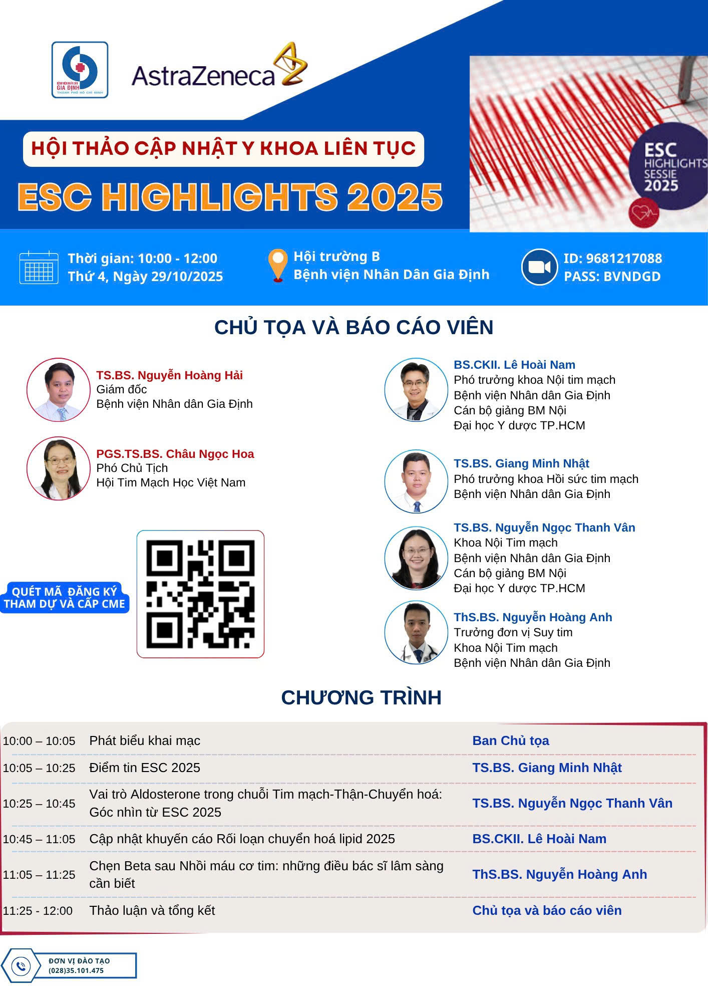 Bệnh viện Nhân dân Gia Định tổ chức chương trình cập nhật y khoa liên tục chủ đề “ESC highlights 2025” với những nội dung sau: