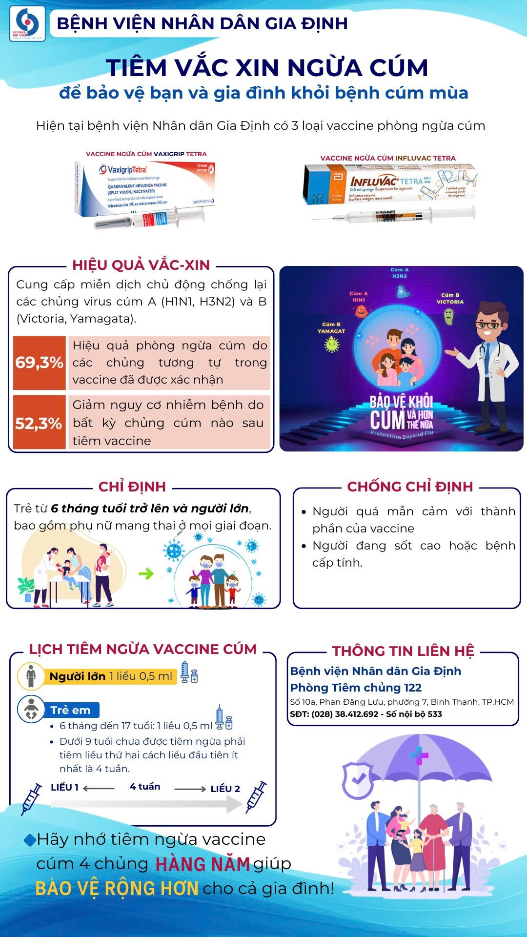 Liên hệ: Phòng Tiêm chủng 122 – Lầu 1, Khoa Khám bệnh, Bệnh viện Nhân dân Gia Định qua số điện thoại 0283 841 2692, bấm tiếp 533.
