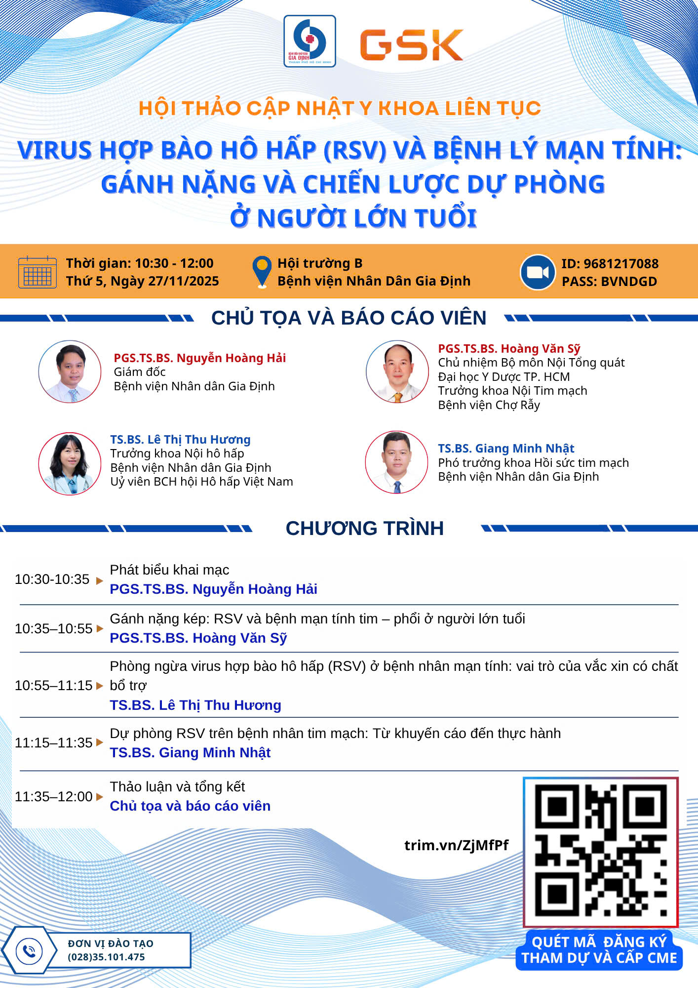 Bệnh viện Nhân dân Gia Định tổ chức chương trình cập nhật y khoa liên tục chủ đề “Virus hợp bào hô hấp (RSV) và bệnh lý mạn tính: Gánh nặng và chiến lược dự phòng ở người lớn tuổi” với những nội dung sau: