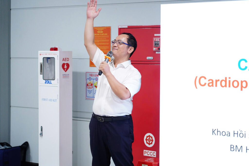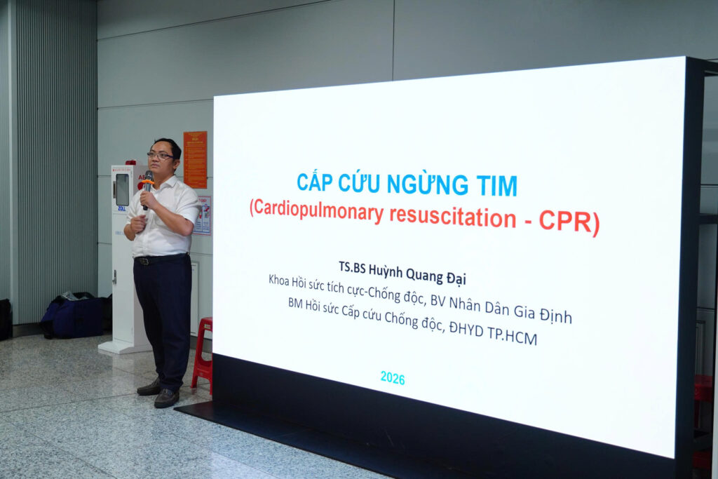 Ngay sau lễ trao tặng, chương trình tiếp tục với hoạt động huấn luyện cấp cứu ngừng tim và hướng dẫn sử dụng máy khử rung tim tự động (AED) do TS.BS Huỳnh Quang Đại, Phụ trách điều hành Khoa Hồi sức tích cực – Chống độc, Bệnh viện Nhân dân Gia Định trực tiếp phụ trách.