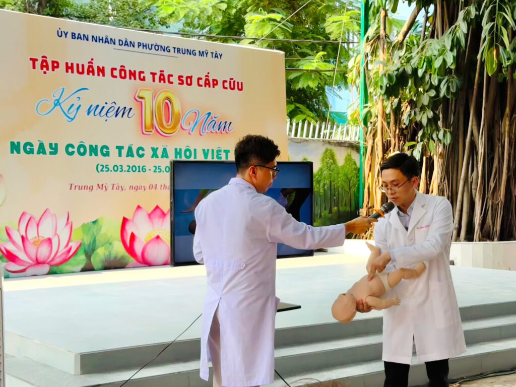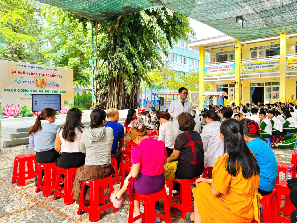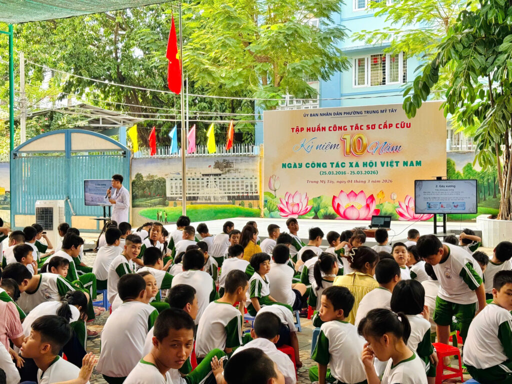 Chiều ngày 04/03/2026, tại Trường Chuyên biệt Ánh Dương, Bệnh viện Nhân dân Gia Định đã phối hợp cùng Uỷ ban Nhân dân phường Trung Mỹ Tây tổ chức chương trình “Tập huấn công tác sơ cấp cứu” cho đội ngũ giáo viên các trường trên địa bàn phường. Chương trình có sự tham dự của đại diện lãnh đạo Uỷ ban nhân dân phường Trung Mỹ Tây, Ban giám hiệu Trường Chuyên biệt Ánh Dương cùng đại diện các trường THCS, Tiểu học, Mầm non trên địa bàn. Tham gia báo cáo tại chương trình là các bác sĩ đến từ Khoa Hồi sức tích cực – Chống độc, Bệnh viện Nhân dân Gia Định.