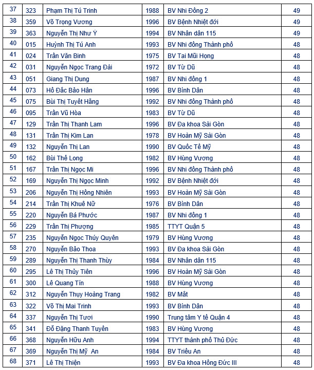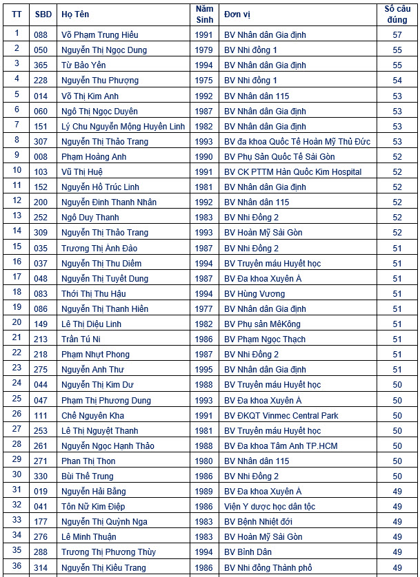Kết quả có 68 thí sinh từ 29 đơn vị trên địa bàn Thành phố Hồ Chí Minh có điểm thi cao nhất tiếp tục bước tiếp vào vòng 2, trong đó Bệnh viện Nhân dân Gia Định có số lượng thí sinh xuất sắc được bước tiếp vào vòng 2 nhiều nhất với 07 thí sinh. Vòng 2 sẽ được tổ chức vào ngày 16/6/2023 tại Sở Y tế.