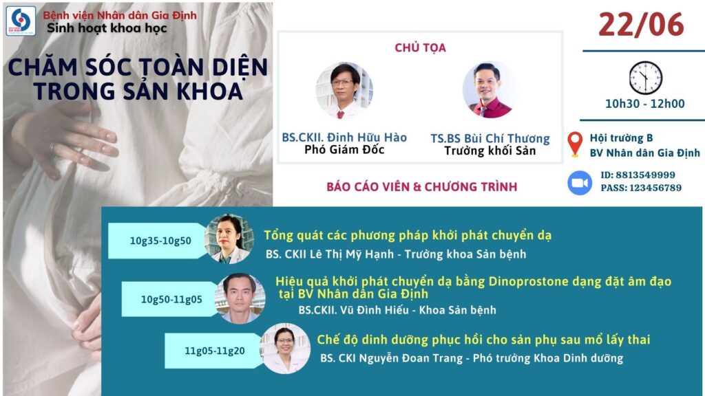 Trong quá trình mang thai, sản phụ thường phải đối mặt với nhiều lo lắng với các vấn đề có thể xảy ra gây ảnh hưởng không tốt đến sức khỏe và sự an toàn của cả sản phụ và thai nhi. Chính vì vậy mà việc chăm sóc sức khỏe cho sản phụ toàn diện là điều rất quan trọng. Với sự tiến bộ của khoa học – kỹ thuật hiện nay có rất nhiều phương pháp cũng như chế độ dinh dưỡng hiểu quả, tối ưu giúp cho sản phụ tiếp cận với sự chăm sóc chủ động hơn trong quá trình mang thai. Kính mời quý Thầy Cô, quý đồng nghiệp quan tâm tham dự buổi Sinh hoạt khoa học với chủ đề: “Chăm sóc toàn diện trong sản khoa” vào lúc 10g30 ngày Thứ Năm ngày 22/6/2023 tại Hội trường B – Bệnh viện Nhân dân Gia Định.