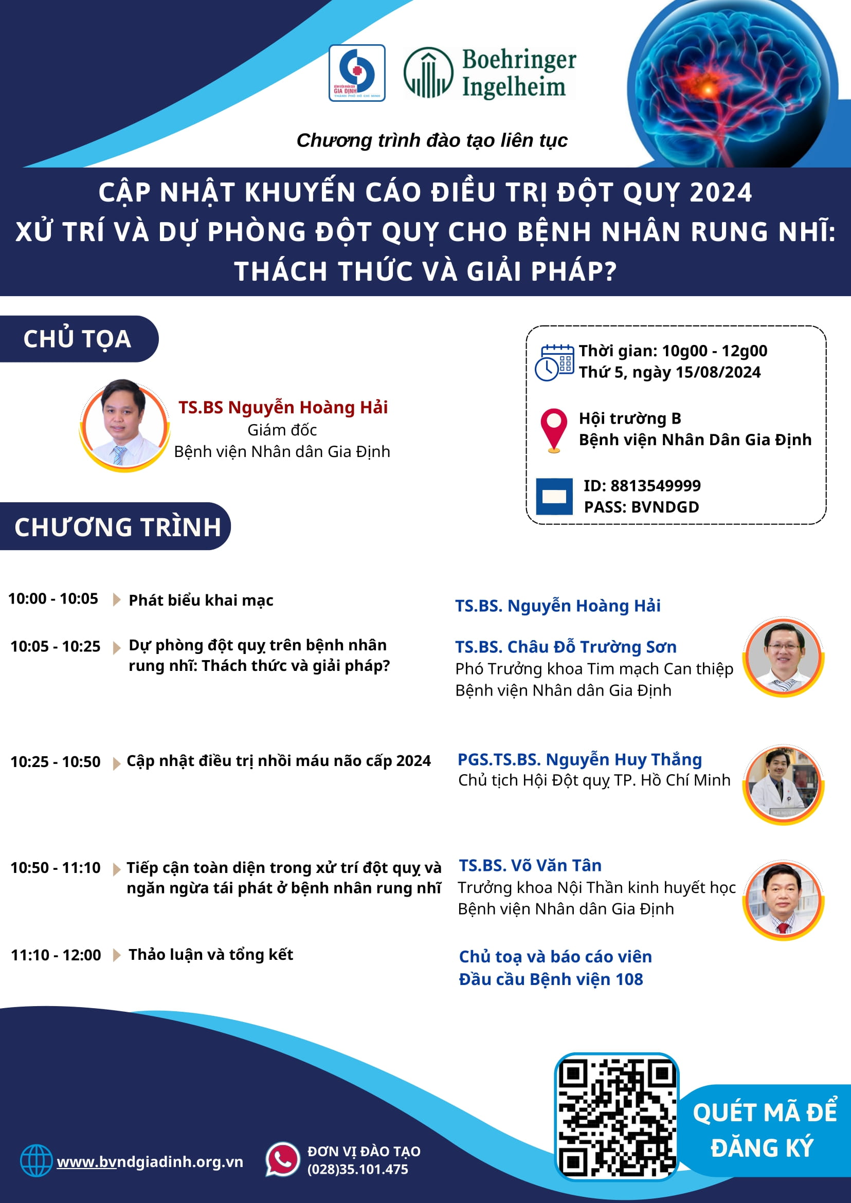 – Tên CME: “Cập nhật khuyến cáo điều trị Đột quỵ 2024. Xử trí và dự phòng đột quỵ cho bệnh nhân rung nhĩ: Thách thức và giải pháp?”