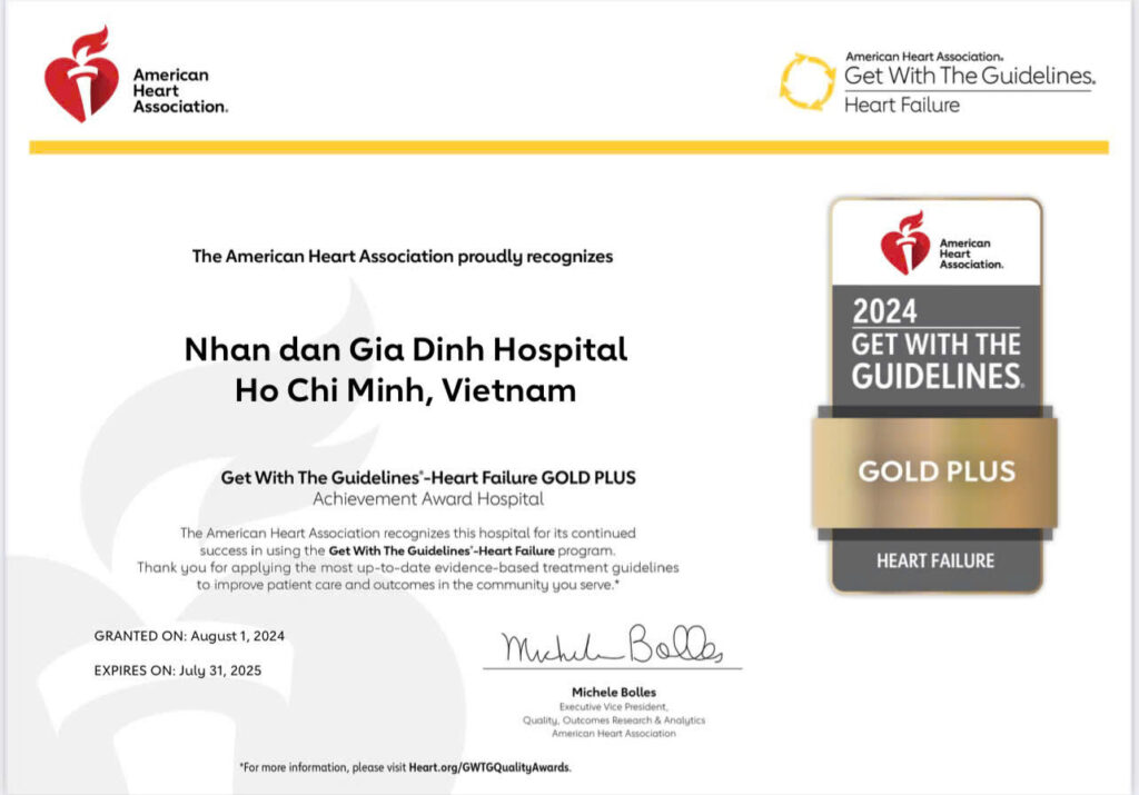 Tròn 1 năm sau khi đón nhận “Chứng nhận bạc” về điều trị suy tim của Hội Tim Hoa Kỳ (AHA), ngày 11/12/2024, bệnh viện Nhân dân Gia Định tiếp tục vinh dự đón nhận “Chứng nhận vàng”. Đây là bệnh viện đa khoa đầu tiên ở nước ta đạt chứng nhận danh giá này